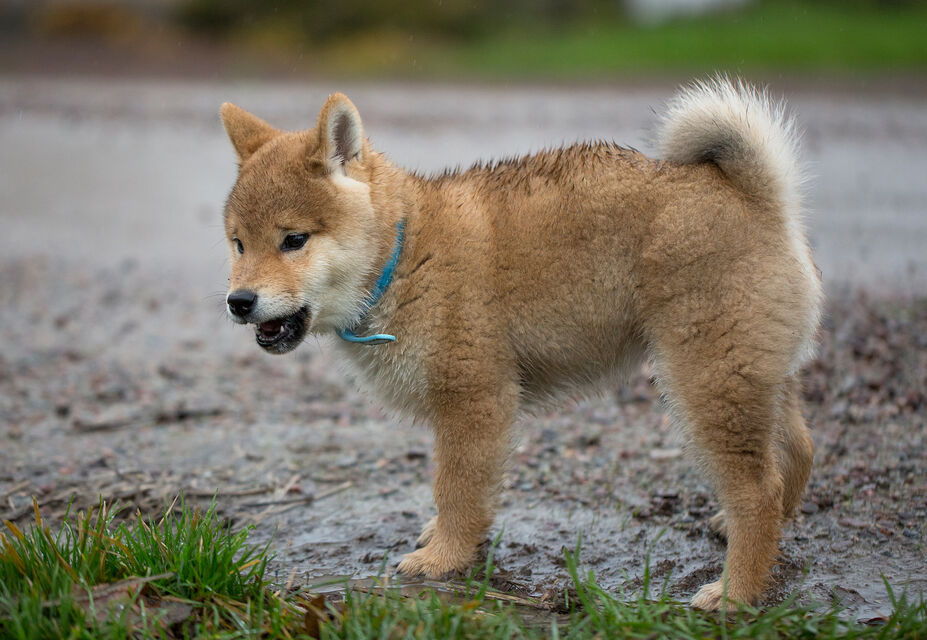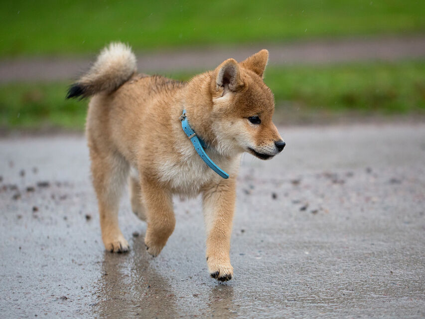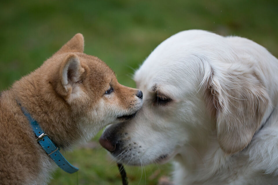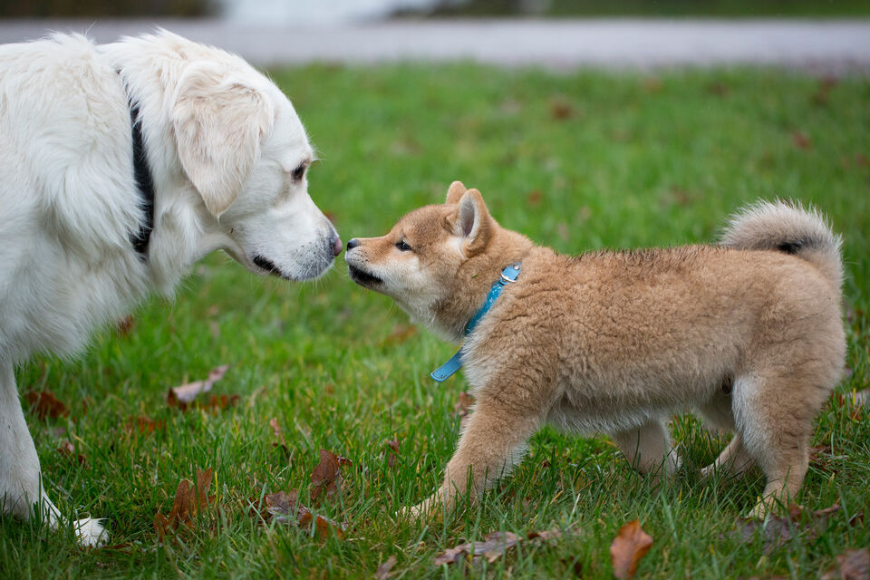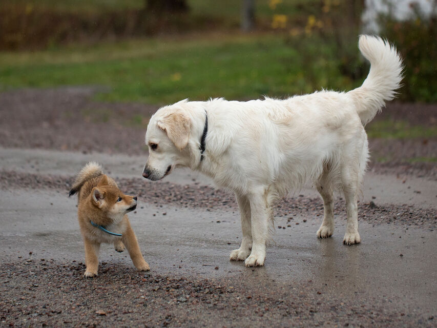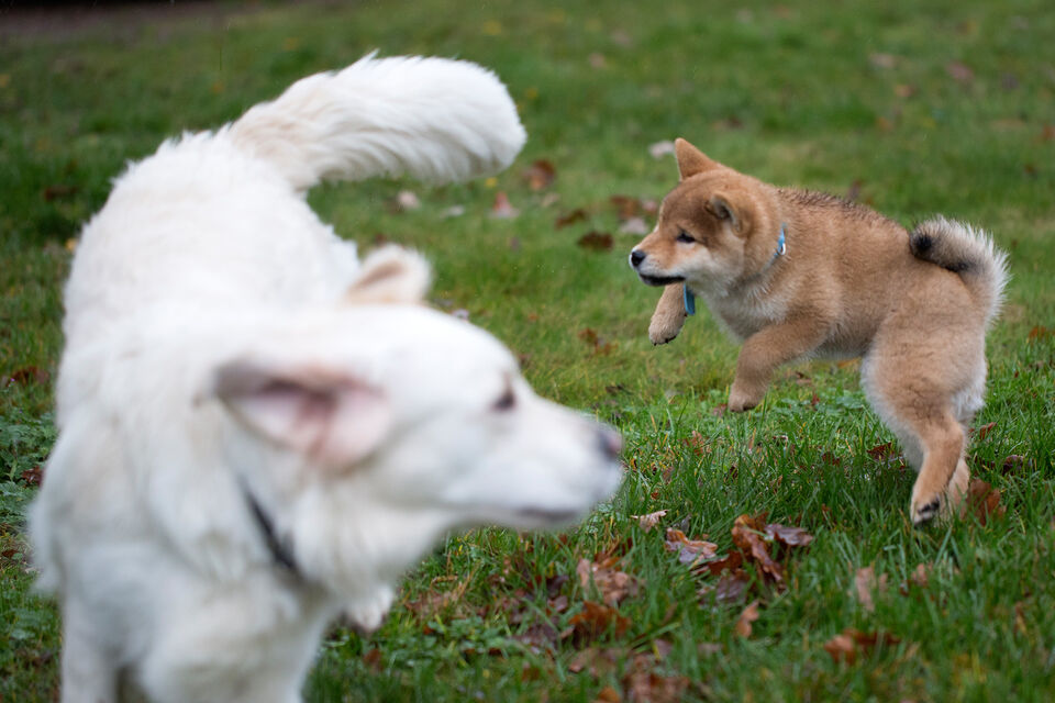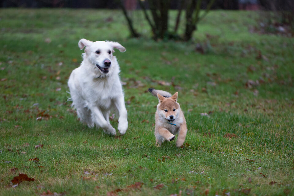 Boris är en ca 3 månader gammal Shiba när han leker med golden retrievern Lina som snart är 2 år.